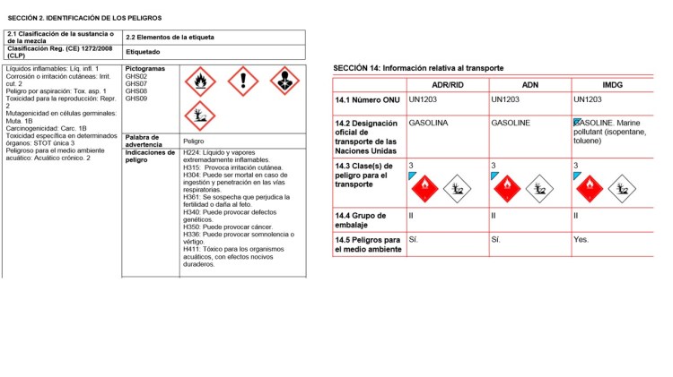 Ahora solo nos falta saber si la gasolina tiene asignada una de las indicaciones de peligro anteriores, ¿y esto como lo podemos saber? Recurriendo a la ficha de datos de seguridad. Esta no es una documentación exigible en el transporte de mercancías peligrosas, muchos confunden todavía la ficha de datos de seguridad con las instrucciones escritas para los miembros de la tripulación, pero son documentos diferentes.
