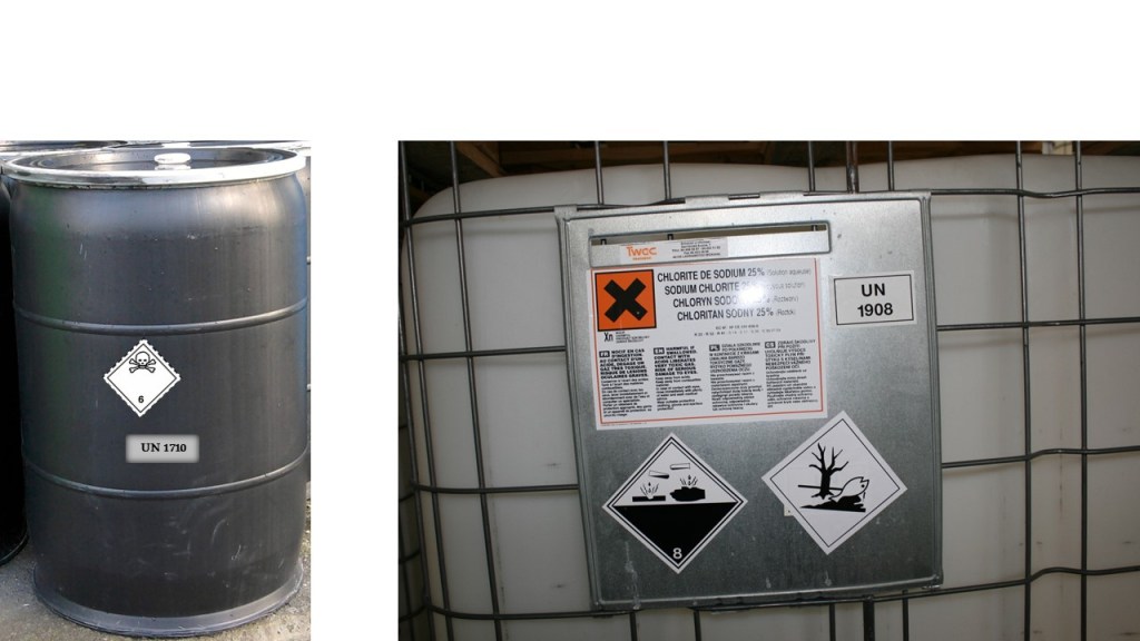 Supongamos que queremos llevar un GRG (IBC) con 700 litros de la mercancía peligrosa UN 1908, Cloritos en Solución, 8, III, (E) “Peligroso para el Medioambiente” categoría de transporte 3 según la columna 15 de la Tabla A del capítulo 3.2 del ADR, junto con un bidón de 100 litros de UN 1710, Tricloroetileno, 6.1, III, (E), categoría de transporte 2. Como podemos comprobar, estas dos materias tienen el mismo grupo de embalaje, pero pertenecen a categorías de transporte diferentes.