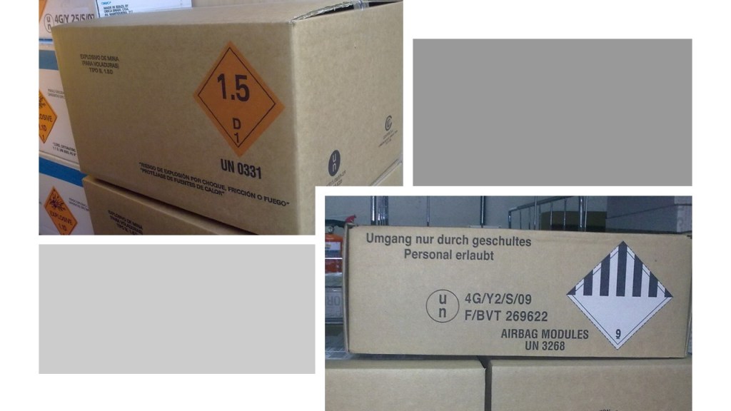 Jerricanes con Peróxido de Hidrógeno en Solución Acuosa y cajas con Explosivos para Voladuras Tipo B.
